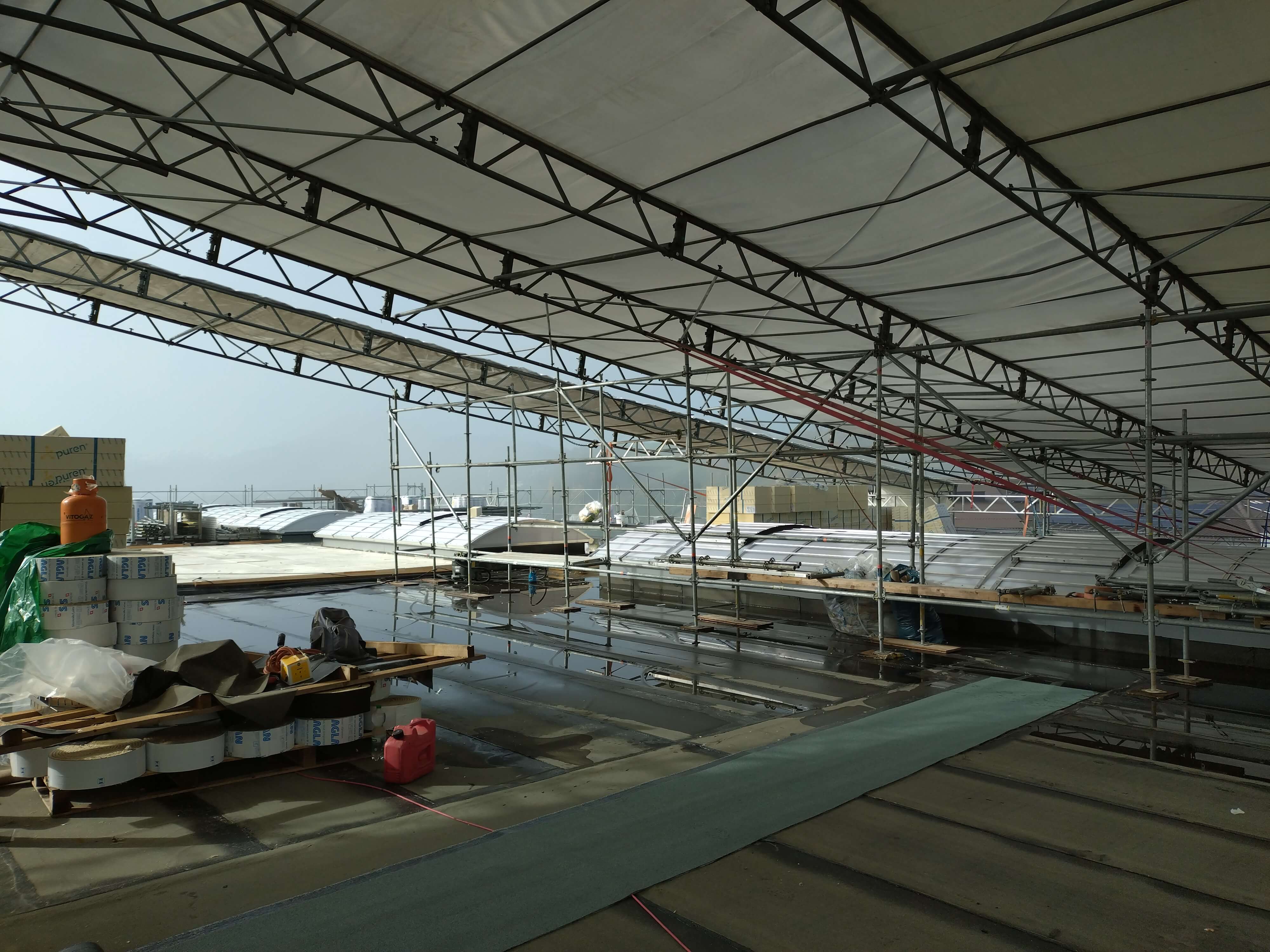 Mit der Demontage des Notdachs, ist unser neues Flachdach nun dicht und kann nun fertiggestellt werden.